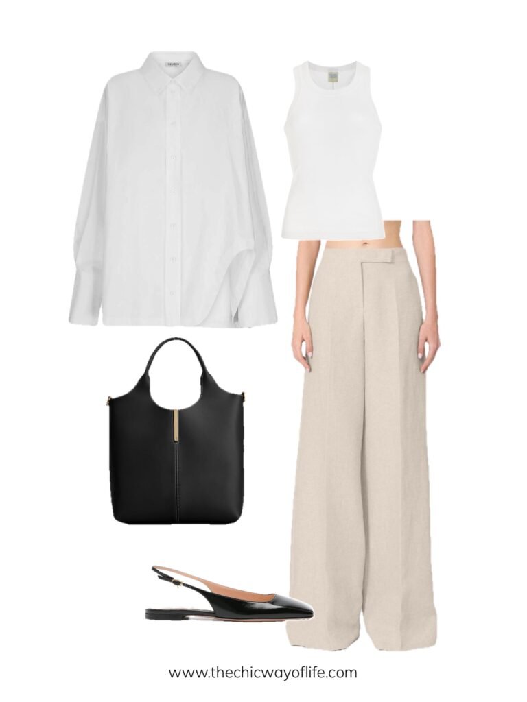 Wear a simple black tee, paired with linen trousers, and add ballet flats. This classic professional combination uses breathable linen to keep you comfortable while looking incredibly polished!