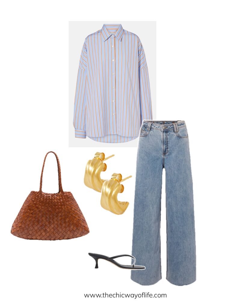 Wear a slightly oversized, relaxed button-down shirt with jeans and flat sandals. This easy combination balances casual comfort with professional presentation. Perfect for laid-back office environments!