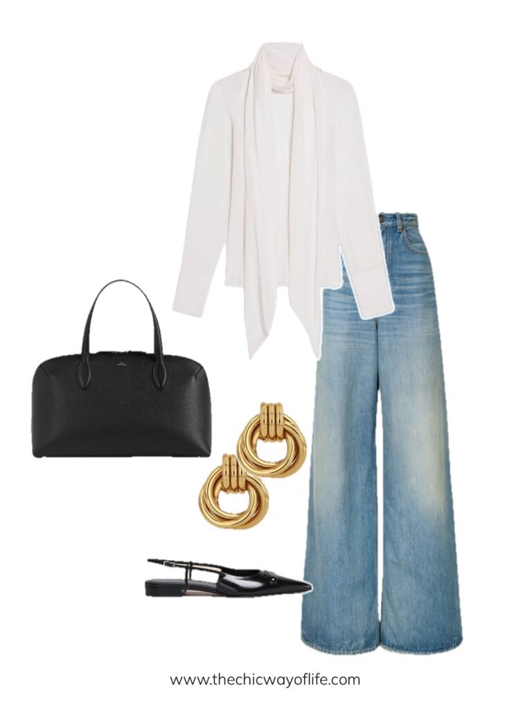 An effortless work look pairing classic jeans with a scarf blouse for a chic yet breathable feel—perfect for staying polished and comfortable on warm office days.