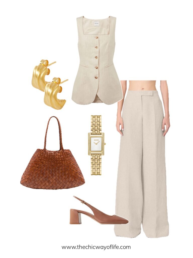 Coordinate a linen vest with matching linen trousers for a sleek monochrome moment, add slingbacks for polish. This tonal look feels incredibly sophisticated while keeping you cool in breathable fabric!