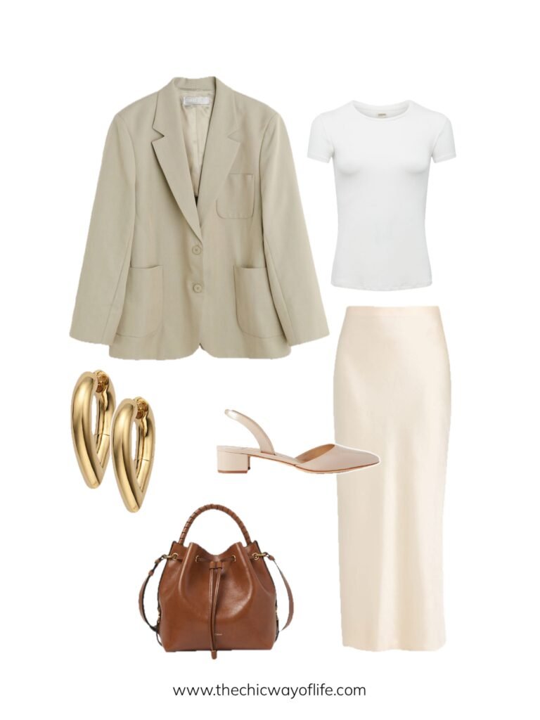 Create a sophisticated look with a satin midi skirt, fitted tee, and structured blazer, finished with heeled slingbacks. The satin adds luxury while the blazer keeps it professional. Perfect for meetings or client presentations!