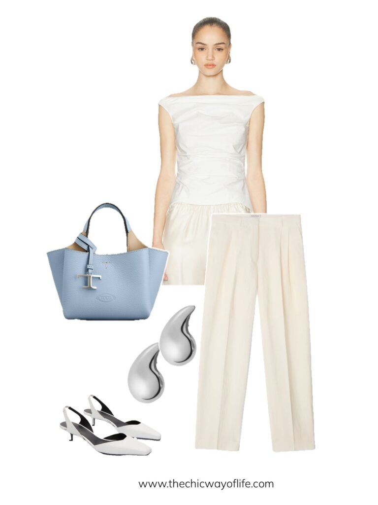 Pair white trousers with a cinched blue button-down shirt creating a crisp, refreshing look. The pop of blue against white is so summer while staying office-appropriate. Add sandals or loafers!