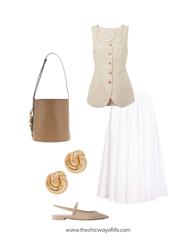 Pair a tailored linen vest with a crisp white skirt and elegant slingbacks. This sleeveless approach keeps you cool while the structured vest maintains professional polish. So chic for summer!