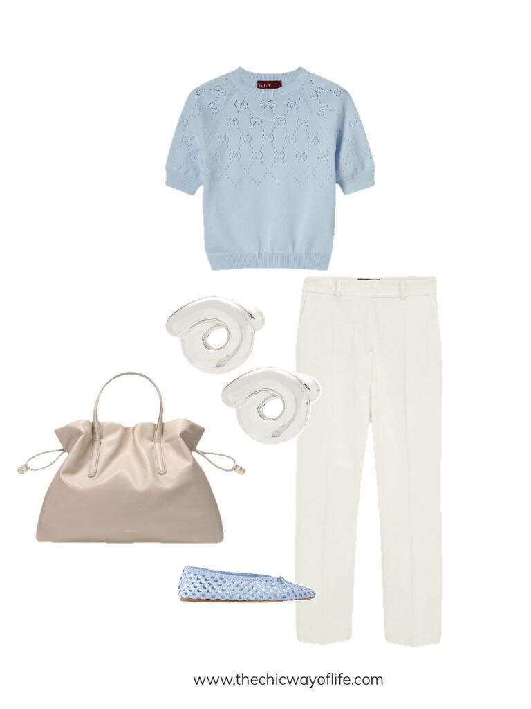Pair crisp cotton trousers with a knit top and ballet flats. Sometimes the best summer office outfits are the simplest – this clean combination is effortlessly chic and works for virtually any professional setting!