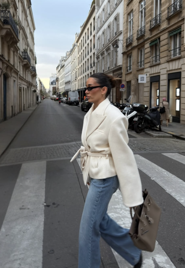 Why it works: White coats feel so fresh for spring! The belted waist adds polish while wide-leg jeans keep it relaxed and modern.