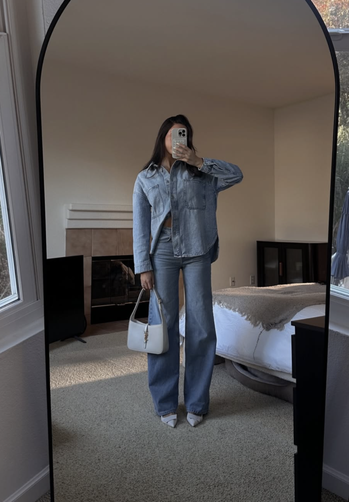 Why it works: The fitted shirt creates a flattering silhouette with wide-leg jeans. This polished denim-on-denim feels put-together!