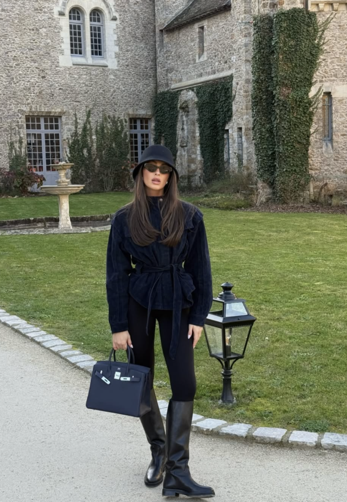 Create an elevated casual look with a belted jacket (wool or tweed) over a fitted knit, paired with black leggings and classic equestrian boots. Add a structured bag and simple jewelry.