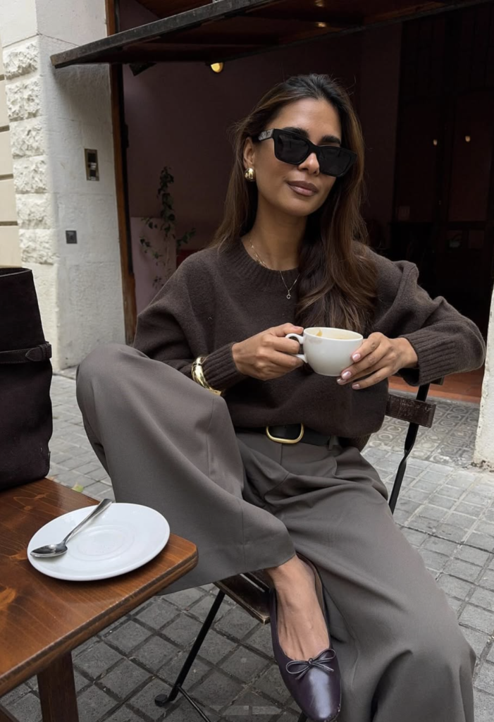 Pair a cozy knit sweater with tailored trousers (add a belt for definition!), then complete with classic ballet flats. Simple, elegant, effortless!