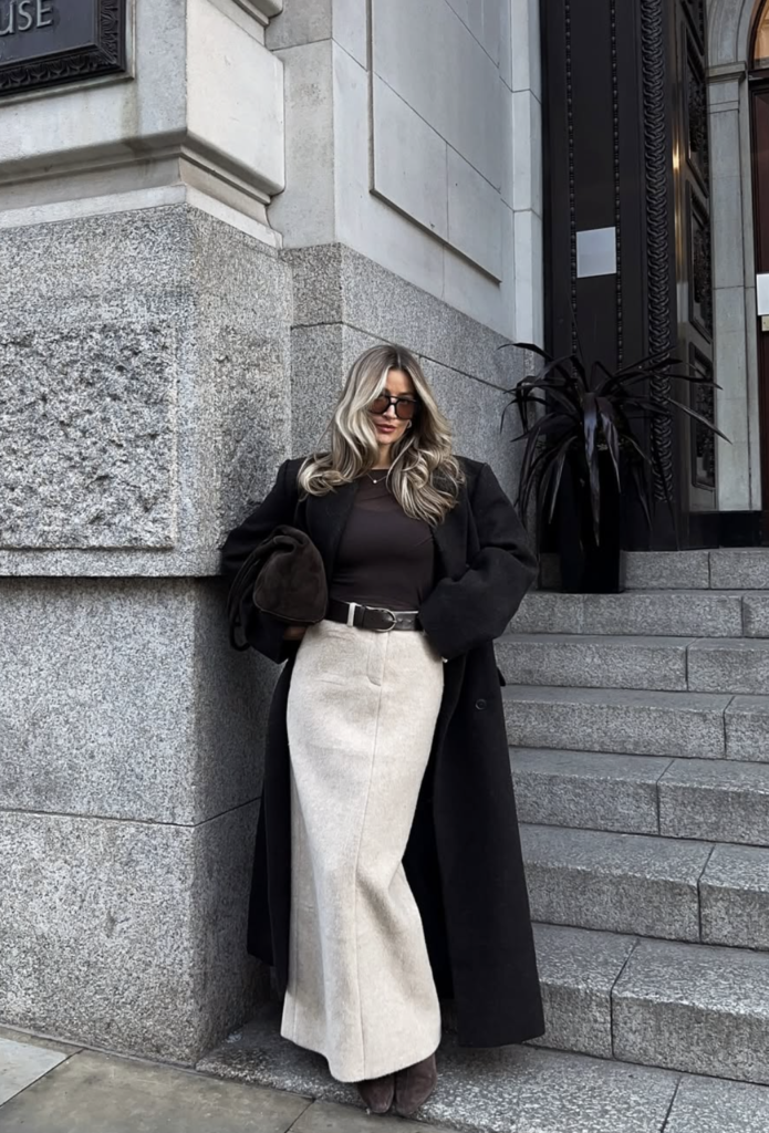 Style a beige maxi skirt with a brown fitted top, layer a black wool coat over everything, and add knee-high boots. The neutral color palette feels sophisticated and spring-appropriate.