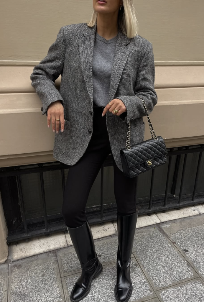 Layer a tailored blazer over a matching knit set (sweater and leggings or fitted pants), then add equestrian boots. Keep it monochromatic for maximum sophistication!