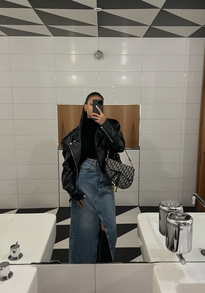 Why it works: The turtleneck keeps you warm, the leather adds edge, and the maxi denim skirt brings that perfect spring freshness.