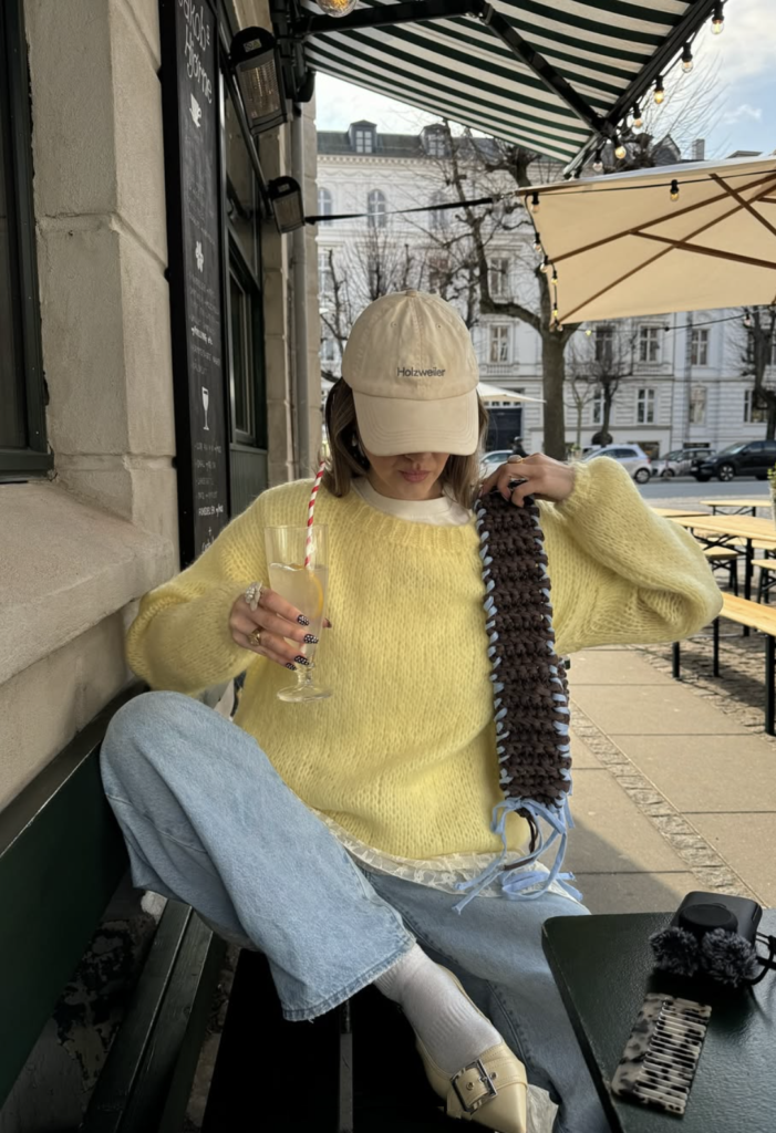 Layer a cheerful yellow oversized knit over a white tee, pair with jeans, add slingbacks with white socks, and top with a baseball cap for sporty-chic vibes.