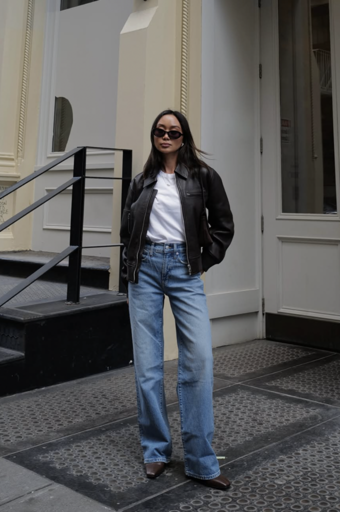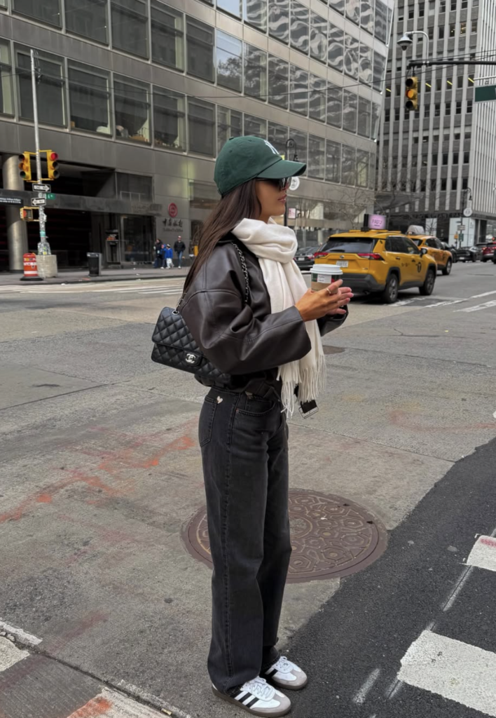 Style dark jeans with a brown leather bomber jacket, white sneakers, and a pop-of-color baseball cap (yellow, pink, or blue!). Keep the top simple – a fitted tee or tank works perfectly.