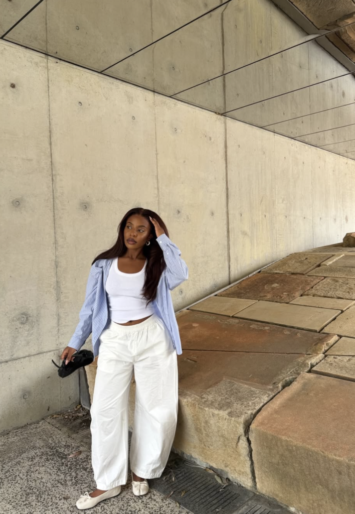 Style baggy cotton trousers with a white tank top, layer a blue-and-white striped button-down over it (worn open), and add ballet flats for effortless spring style.