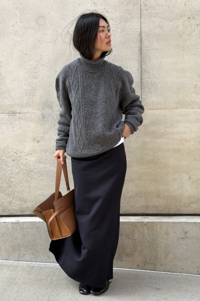 Layer an oversized knit sweater over a simple tee, pair with a black maxi skirt, and add ballet flats. Keep accessories minimal with a tote bag and delicate jewelry.