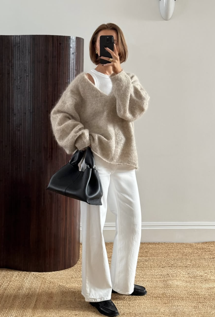 Style white jeans with a tank top layered under an oversized V-neck knit sweater, then add loafers. Keep it simple with a tote bag and minimal jewelry.