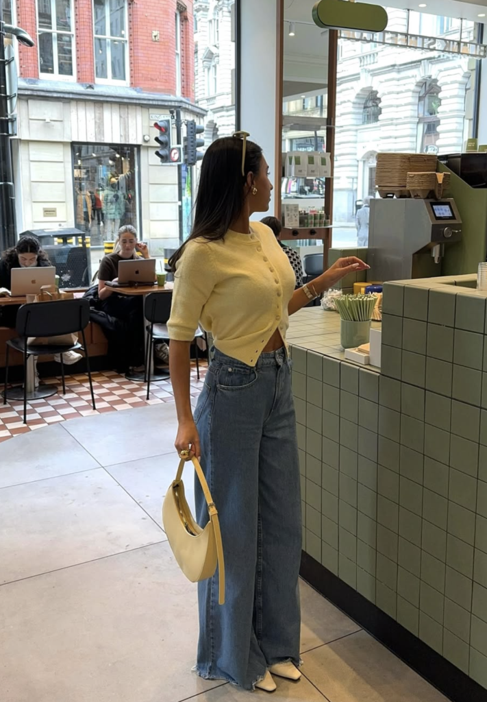 23. Yellow Fitted Cardigan with Wide-Leg Jeans