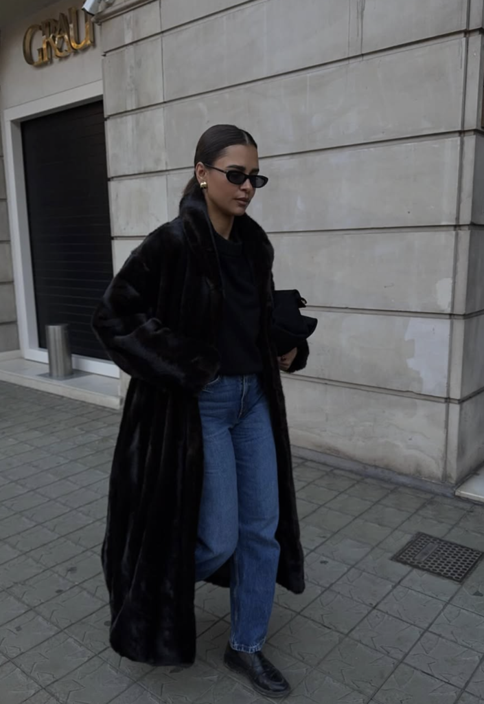 - Straight or slim jeans – Balances the volume of fur beautifully