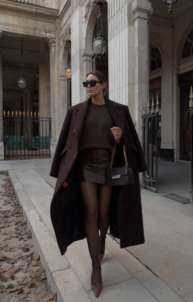 Look 2: Fitted Brown Knit + Mini Skirt + Statement Coat Fitted crewneck tucked into leather or wool mini skirt. Layer an oversized coat over everything. Add slingbacks. Chic for a date or lunch meetings.