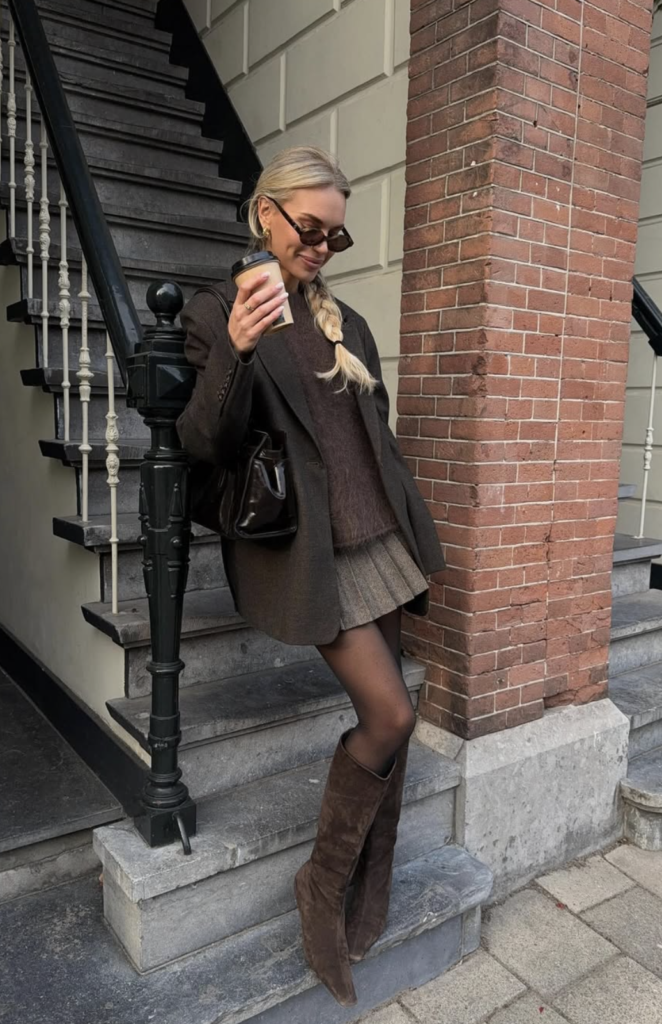Look 4: Brown Sweater + Mini Skirt + Blazer Mohair knit with structured blazer and mini skirt. Add suede knee-high boots for elongation and texture. Professional yet trendy for creative offices.