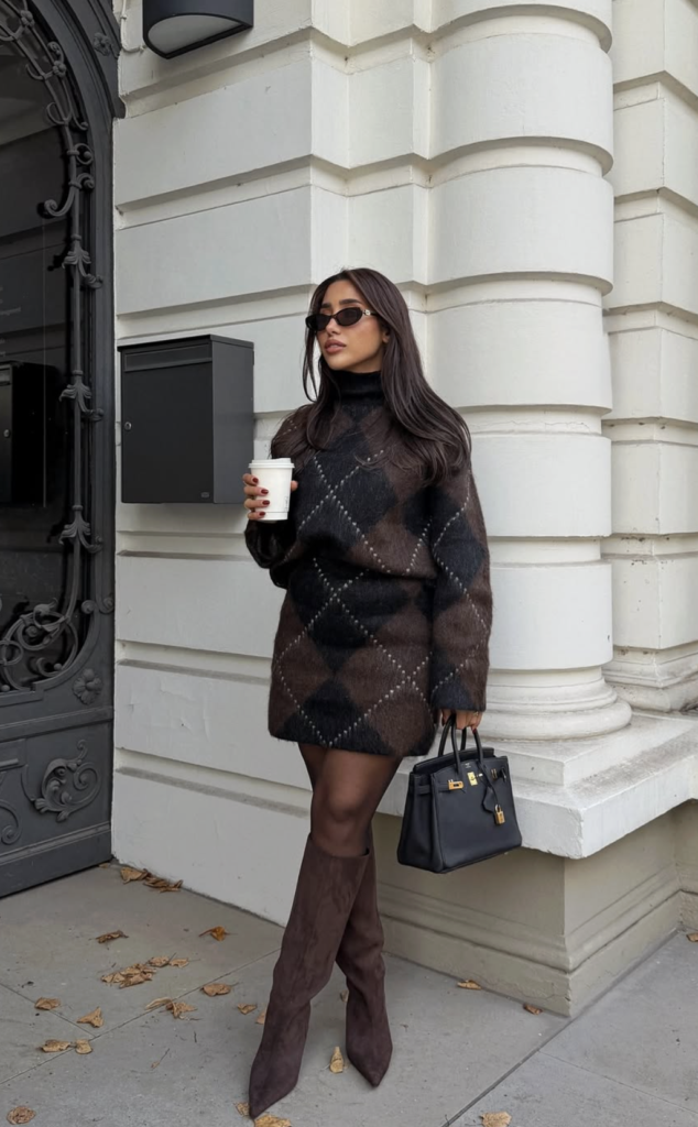 Look 5: Matching Knit Ensemble Coordinated brown sweater and knit skirt set with an argyle pattern twist. Elevated with knee high boots. Add gold jewelry for polish. Perfect for days when you want easy elegance!