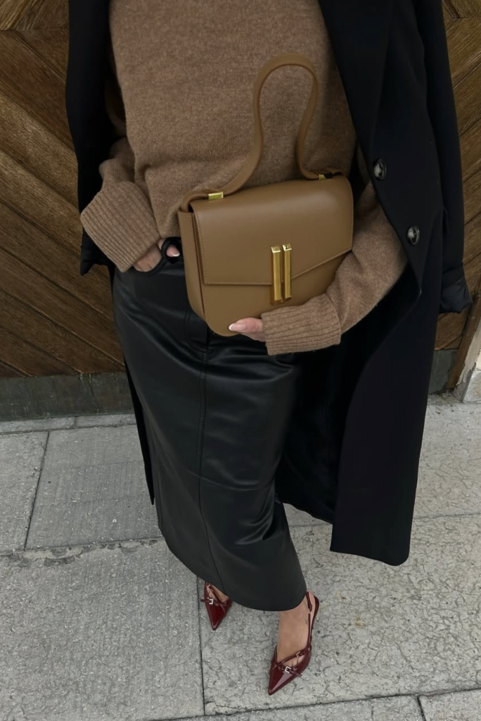 Look 16: Brown Sweater + Leather Maxi + Coat Oversized turtleneck with black leather maxi skirt, long wool coat, and slingbacks. Dramatic proportions, sophisticated styling. Perfect for upscale events or dinners!