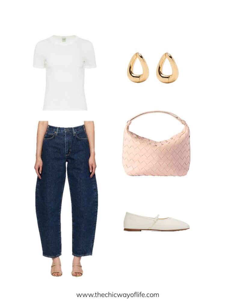 Keep it simple with a white tee and trendy barrel jeans, then add ballet flats for effortless spring style. This minimalist combo lets the unique jean shape be the star!