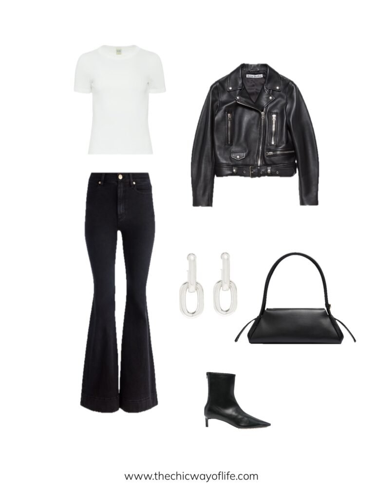 Style black jeans with a simple tee, classic black leather jacket, and ankle boots. This timeless combination creates an edgy-casual vibe that works for everything from coffee runs to casual dinners.