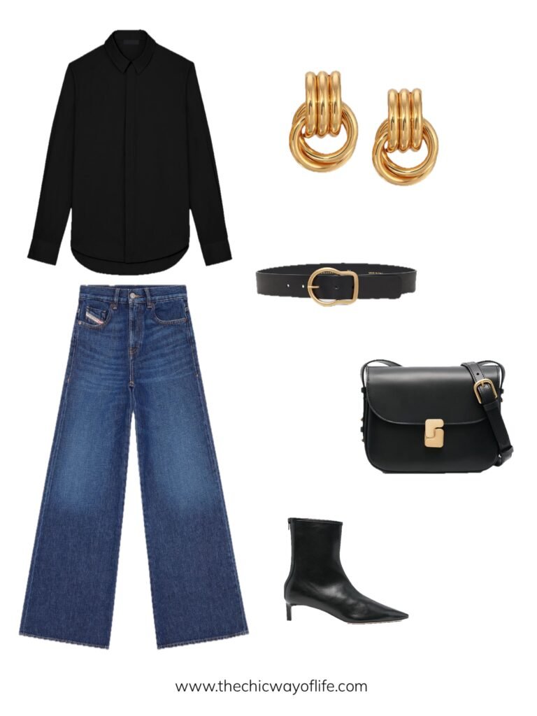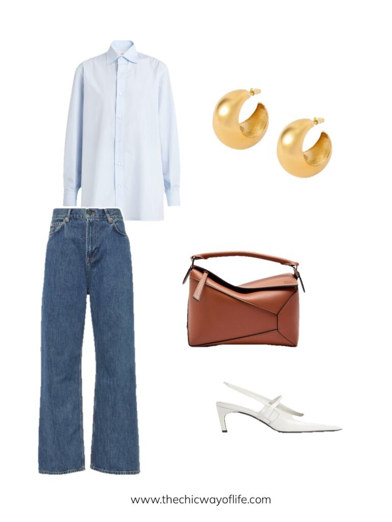 Style wide-leg jeans with a crisp button-down shirt (try some colour or stripes!) and slingbacks. This polished casual outfit works beautifully for brunch or shopping days when you want to look put-together!