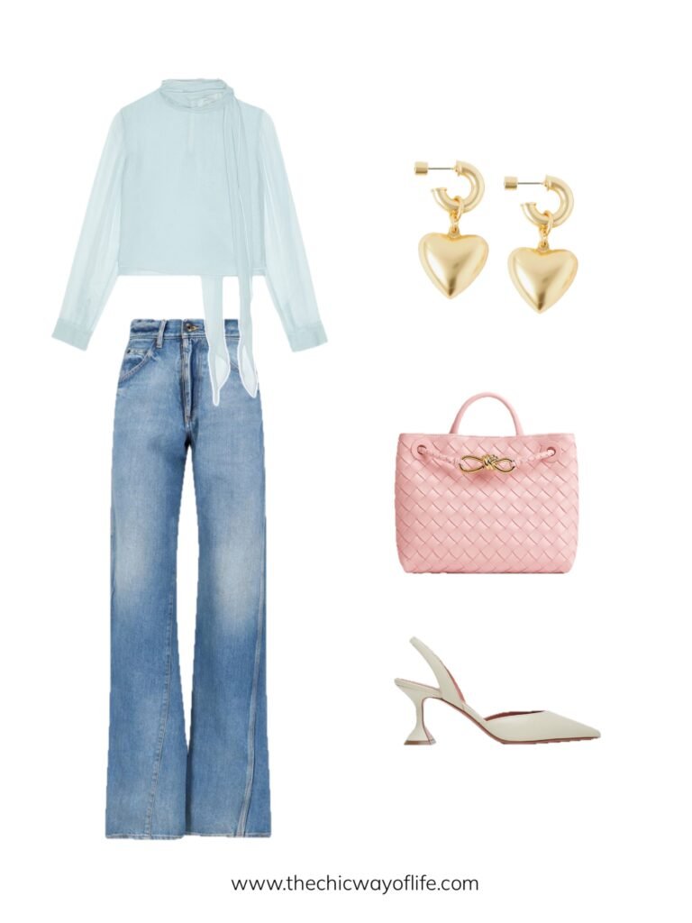 Pair wide-leg jeans with a soft blue blouse and elegant slingbacks. The flowing silhouette combined with the spring color creates a breezy, feminine casual look!