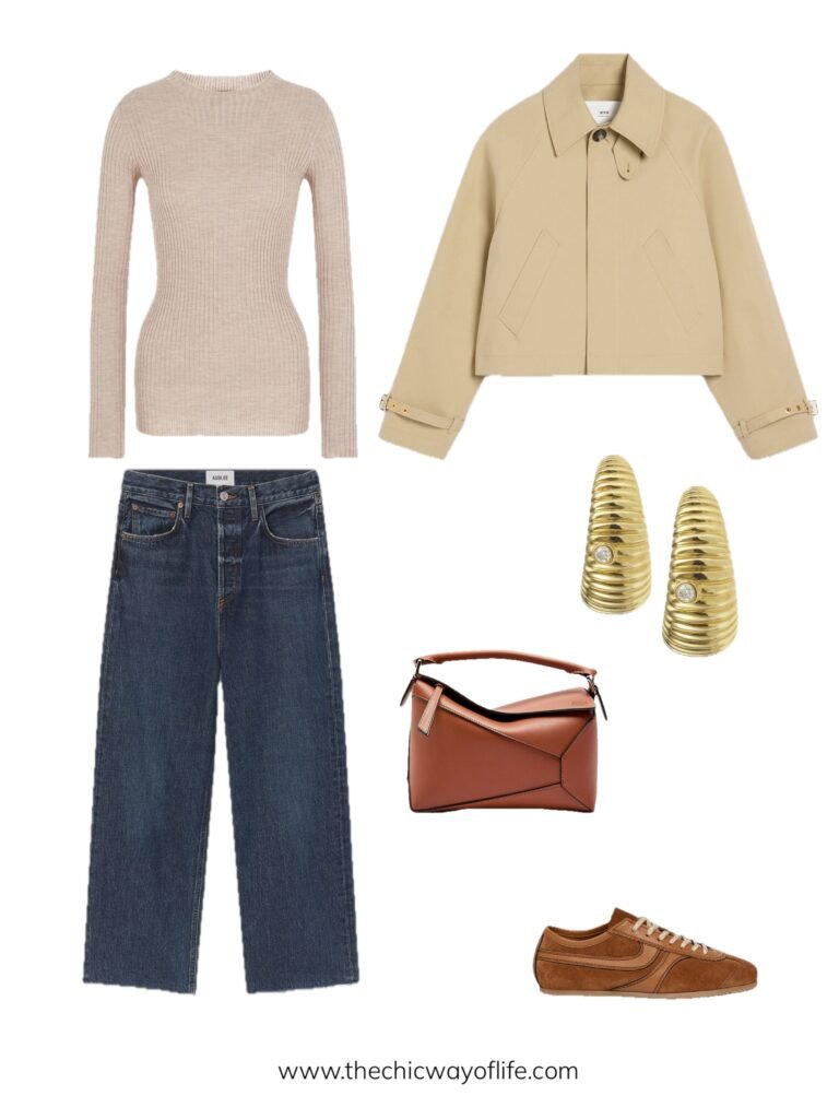Create a modern casual look with a fitted knit top, cropped trench coat, straight jeans, and sneakers. The cropped trench feels fresh and contemporary while sneakers keep it comfortable!
