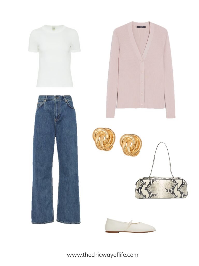 Pair straight jeans with a fitted tee and soft pink cardigan, then add ballet flats. The pop of pink brings instant spring freshness while keeping the look casual and approachable!
