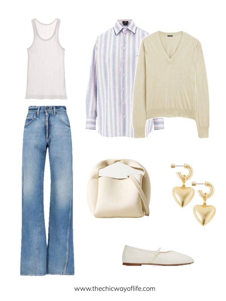 Layer a striped shirt over a tank top, tie or drape a colorful knit around your waist or casually over your shoulders, then pair with wide-leg jeans. The layered knit adds that effortless old money or modern 90s touch depending on how you style it!