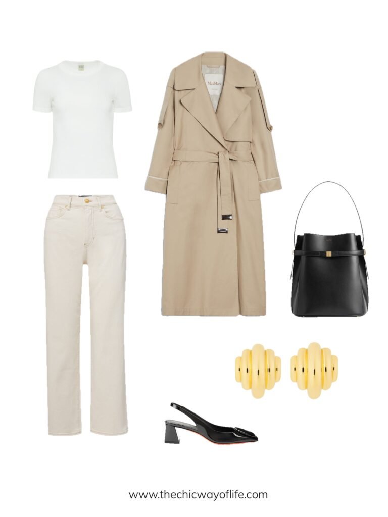 Layer a trench coat over a simple tee, pair with cream straight jeans, and add charming Mary Jane shoes. This sophisticated casual look is perfect for spring errands or lunch dates!