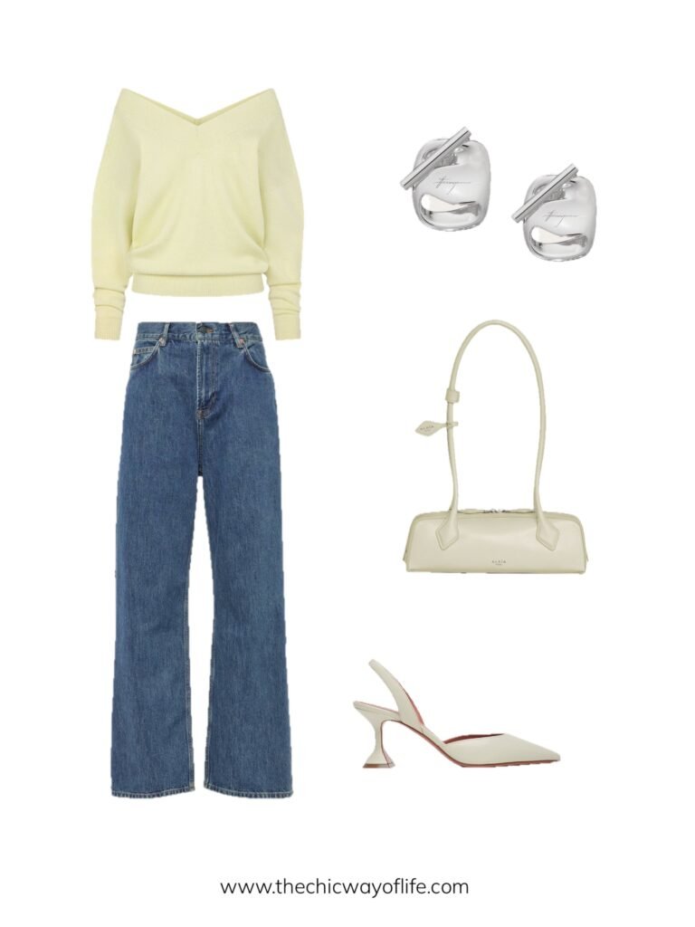Make a statement with a cheerful yellow off-shoulder knit sweater paired with dark blue jeans and slingbacks. The pop of color and feminine neckline create such a fun spring vibe!