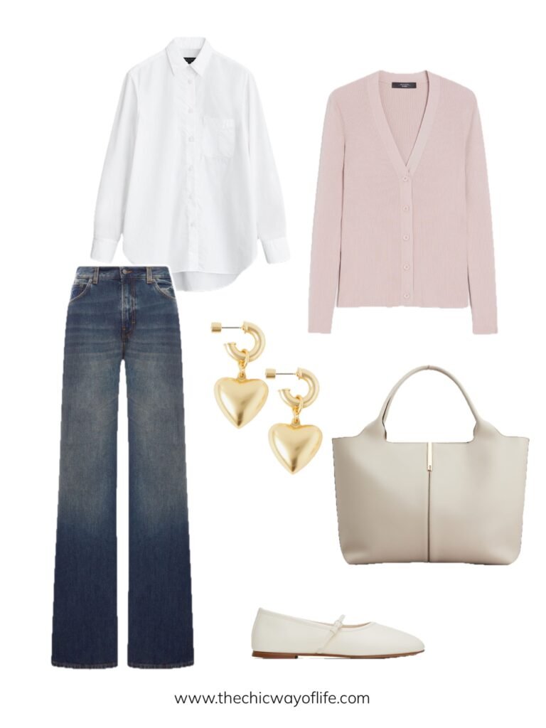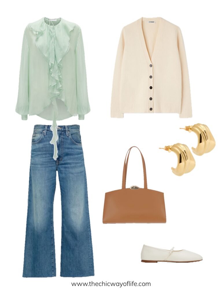 Romantic blouse paired with jeans, cozy cardigan for layering, ballet flats, and a tote bag. This feminine look is perfect for days when you want to embrace that soft, romantic spring energy!