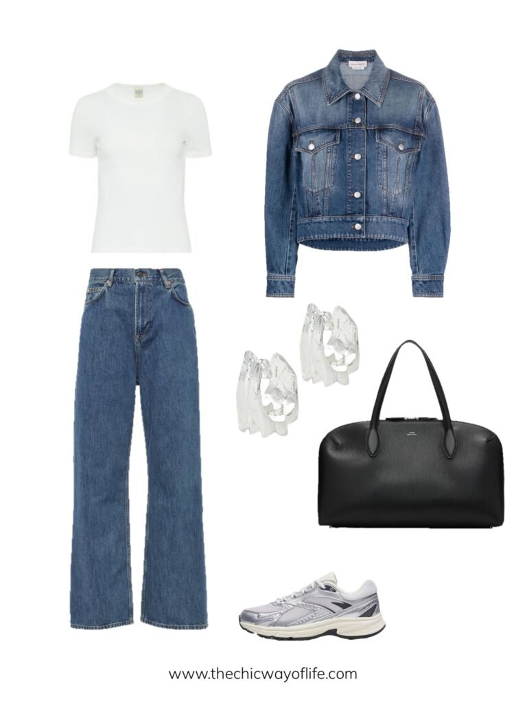 Spring outfits for school with a fitted tee with jeans, classic denim jacket, comfortable sneakers, and a tote bag. This is your reliable everyday formula – easy, wearable, and works for literally any spring school day!