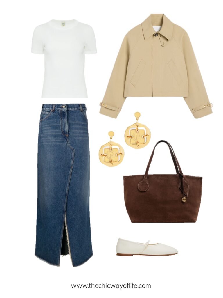 Simple tee with a denim skirt, timeless trench jacket, ballet flats, and a tote bag. This Parisian-inspired look is effortlessly chic and works for everything from classes to coffee dates between lectures!