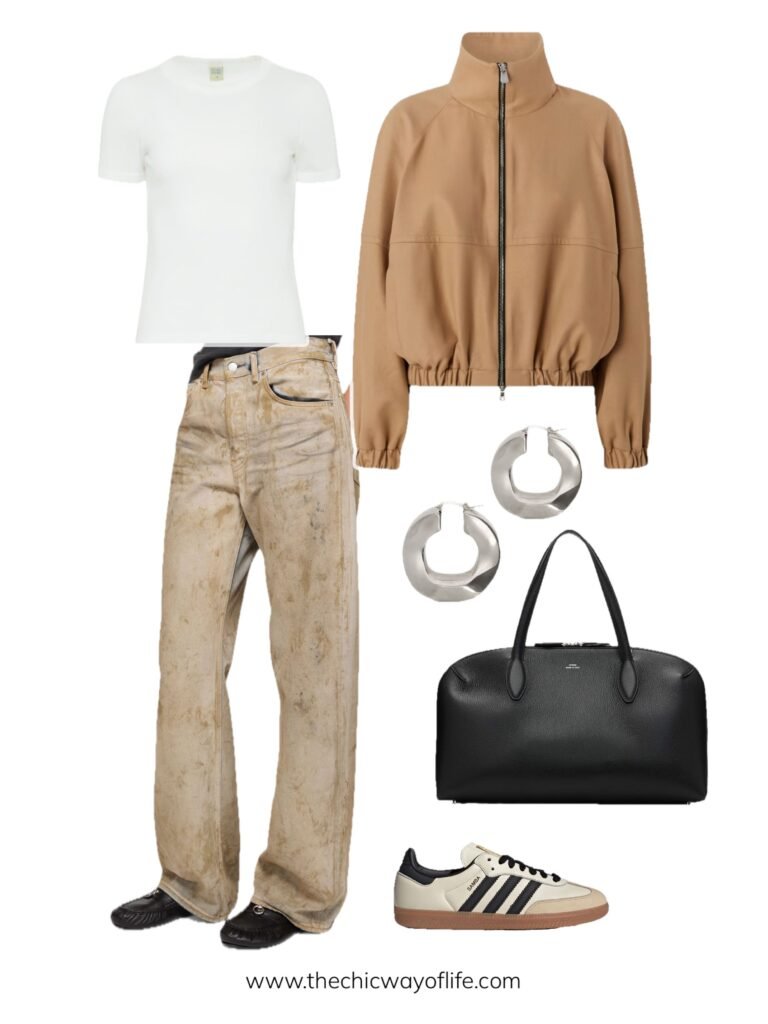 Basic tee with your favorite jeans, sporty varsity jacket, comfortable sneakers, and a tote bag. This laid-back look is ideal for early morning classes or casual Friday vibes. Comfortable and effortlessly cool!