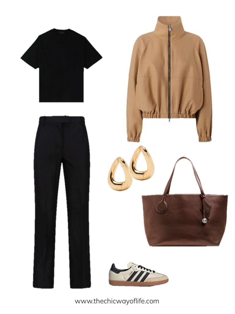 Spring outfits for school with a basic tee with trousers, contemporary funnel jacket, sneakers, and a tote bag. This modern combination balances casual and polished for that effortless student style!