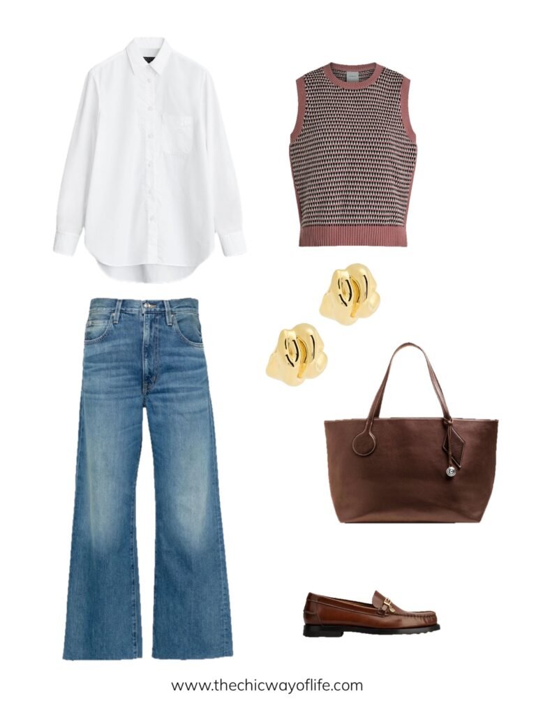 Knit vest layered over a crisp button-down shirt, paired with jeans, blazer for structure, loafers, and a tote bag. This layered preppy look is giving major vintage college aesthetic – studious but stylish!