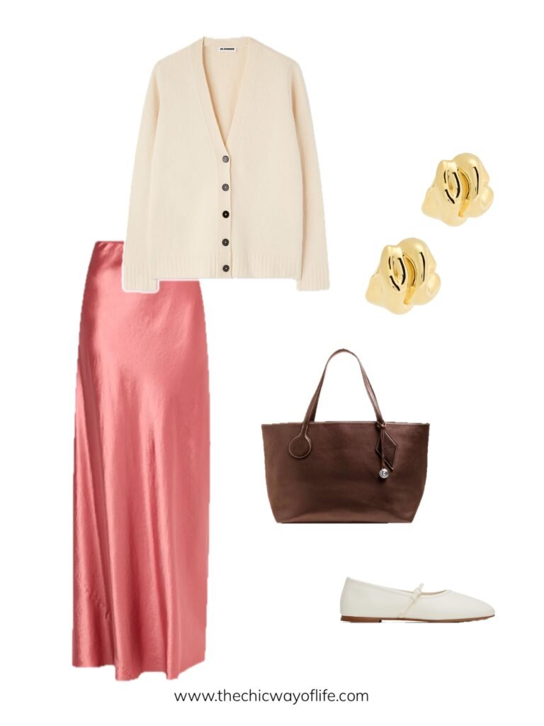 Cozy cardigan paired with a flowy satin skirt, ballet flats for comfort, and a tote bag for all your essentials. This feminine outfit is perfect for days when you want to feel pretty but still practical for campus life!