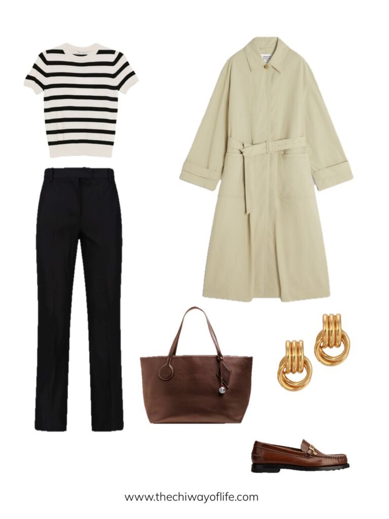 Striped knit tee tucked into trousers, classic trench coat for layering, comfortable loafers, and a tote bag. The stripes add personality while the trench keeps it polished. Perfect for those long lecture days!
