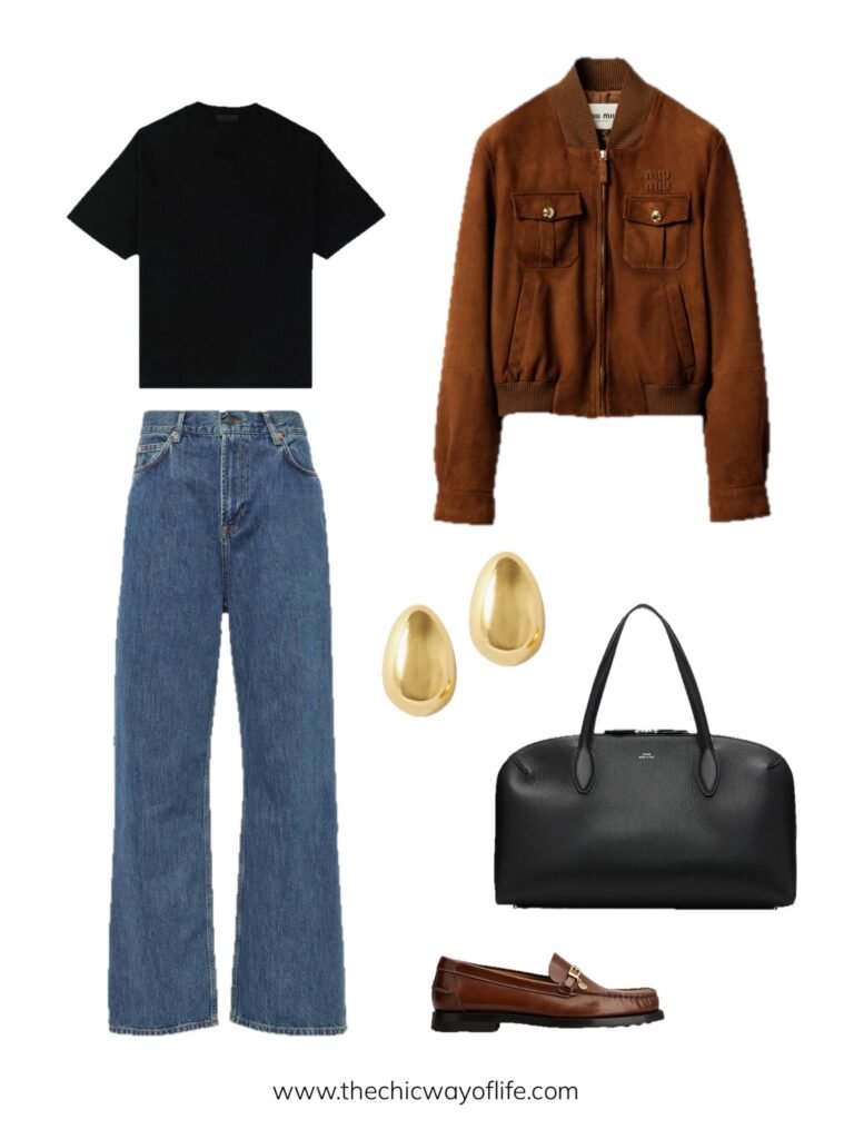 Basic tee with jeans, suede jacket for texture and interest, comfortable sneakers, and a tote bag. The suede jacket adds that elevated touch that makes this casual outfit feel special and intentional!