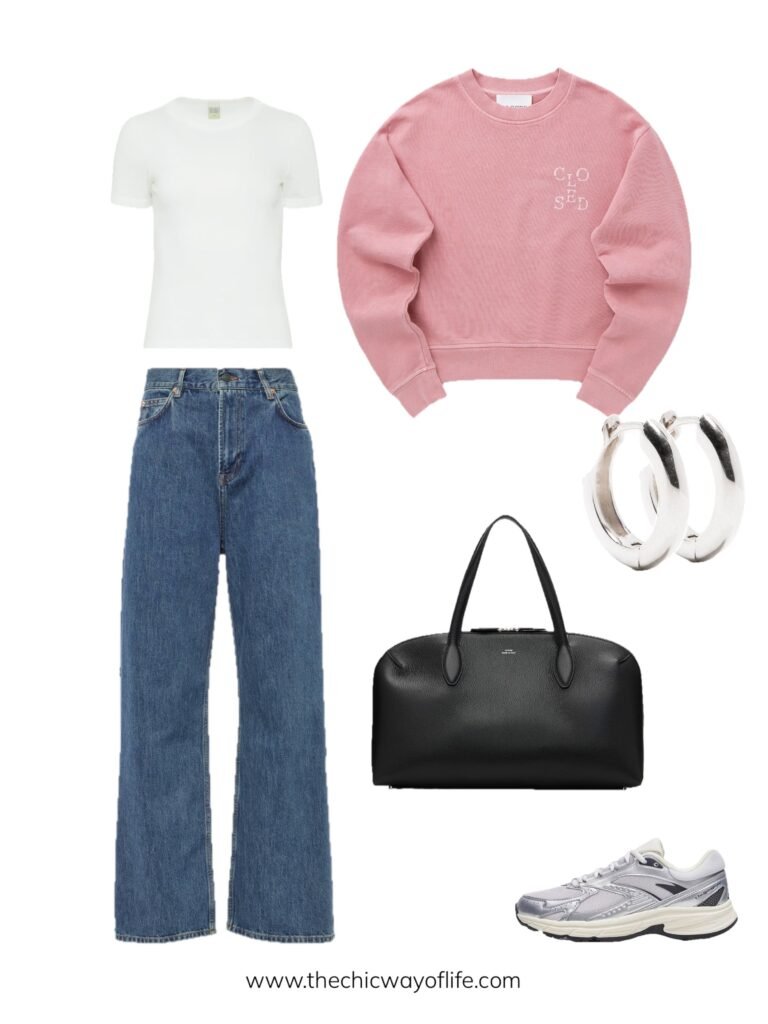 Spring outfits for school with comfortable sweatshirt with jeans, classic sneakers, and a tote bag. Sometimes simple is best – this clean, minimalist look is effortless, comfortable, and always looks intentional!