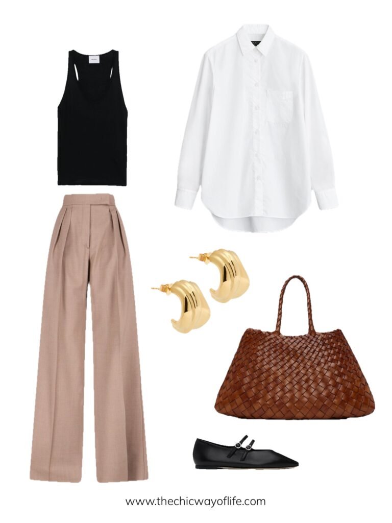 Tank top layered under a button-down shirt (worn open or buttoned), paired with jeans, ballet flats, and a tote bag. The layering adds dimension and makes this basic combo feel more thoughtful and stylish!
