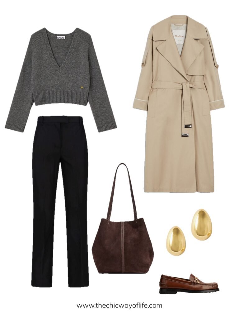 V-neck knit sweater with tailored trousers, sophisticated trench jacket, polished loafers, and a tote bag. This elevated combination works beautifully for presentations, meetings with professors, or days when you just want to look extra put-together!