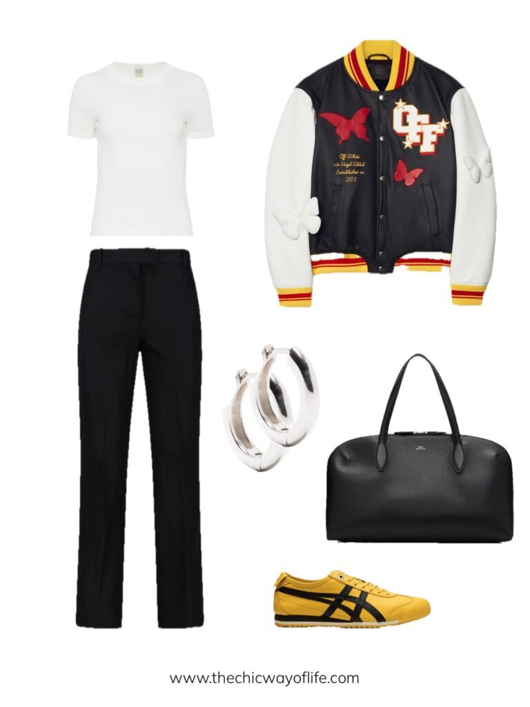 Spring outfits for school with a simple tee with trousers, sporty varsity jacket, comfortable sneakers, and a tote bag. This athletic-inspired look is perfect for days when you have gym class or just want that sporty-casual vibe!