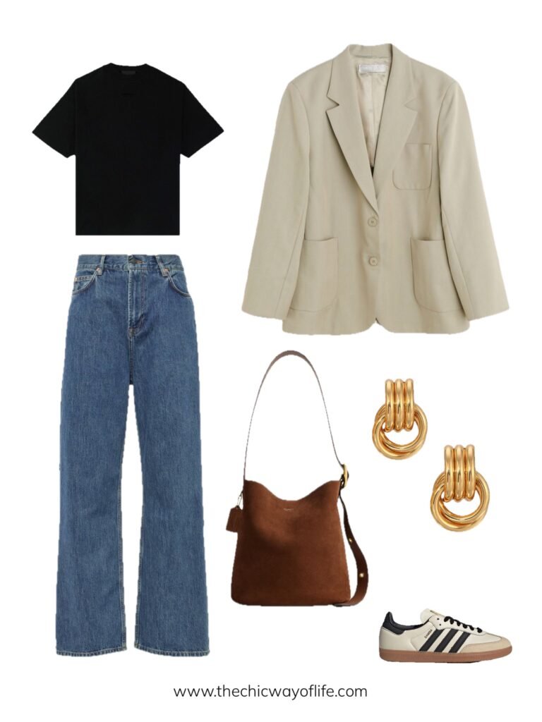 Basic tee tucked into trousers, structured blazer for instant polish, comfortable sneakers, and a tote bag. The blazer elevates the casual base while sneakers keep it wearable for all-day campus life!