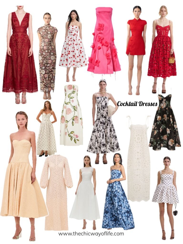 The cocktail dress sweet spot – not too formal, not too casual. Spring cocktail dresses are perfect for engagement parties, birthday celebrations, work events, or any occasion with a “smart chic” dress code. This is where you can really have fun with prints, textures, and playful silhouettes!
